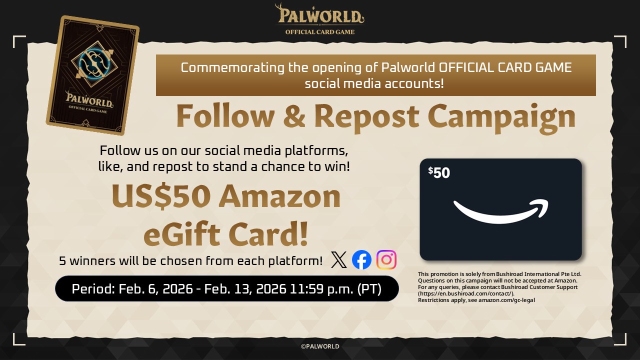 To commemorate the launch of the Palworld OFFICIAL CARD GAME, we will be running a giveaway campaign on our social media channels!